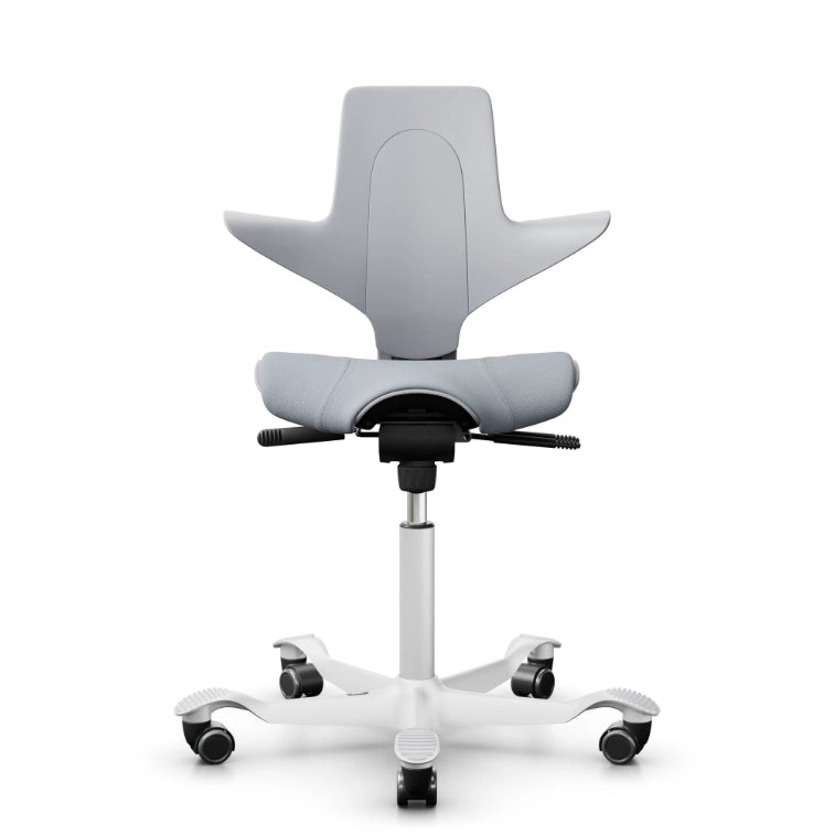 The HAG Capisco Puls 8020 is a flexible saddle chair designed for active sitting across low and high working positions. The light grey fabric seat provides comfort during extended use, while the unique saddle design promotes better posture and movement throughout the workday.